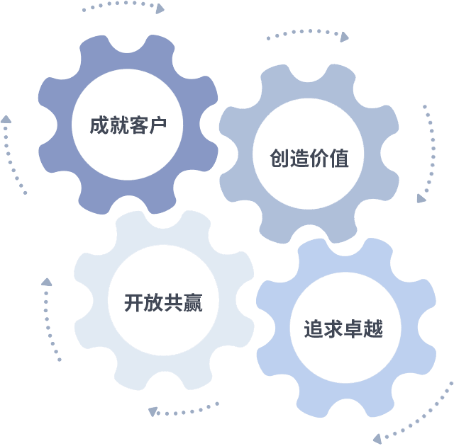 成就客户是一切决策的出发点,,,创造价值是衡量所有工作的标准,,,追求卓越是我们做事做人的态度,,开放共赢是我们的格局也是最终的结果。。。价值观的齿轮环环相扣,,推动着组织里的每个人不断向前。。。。