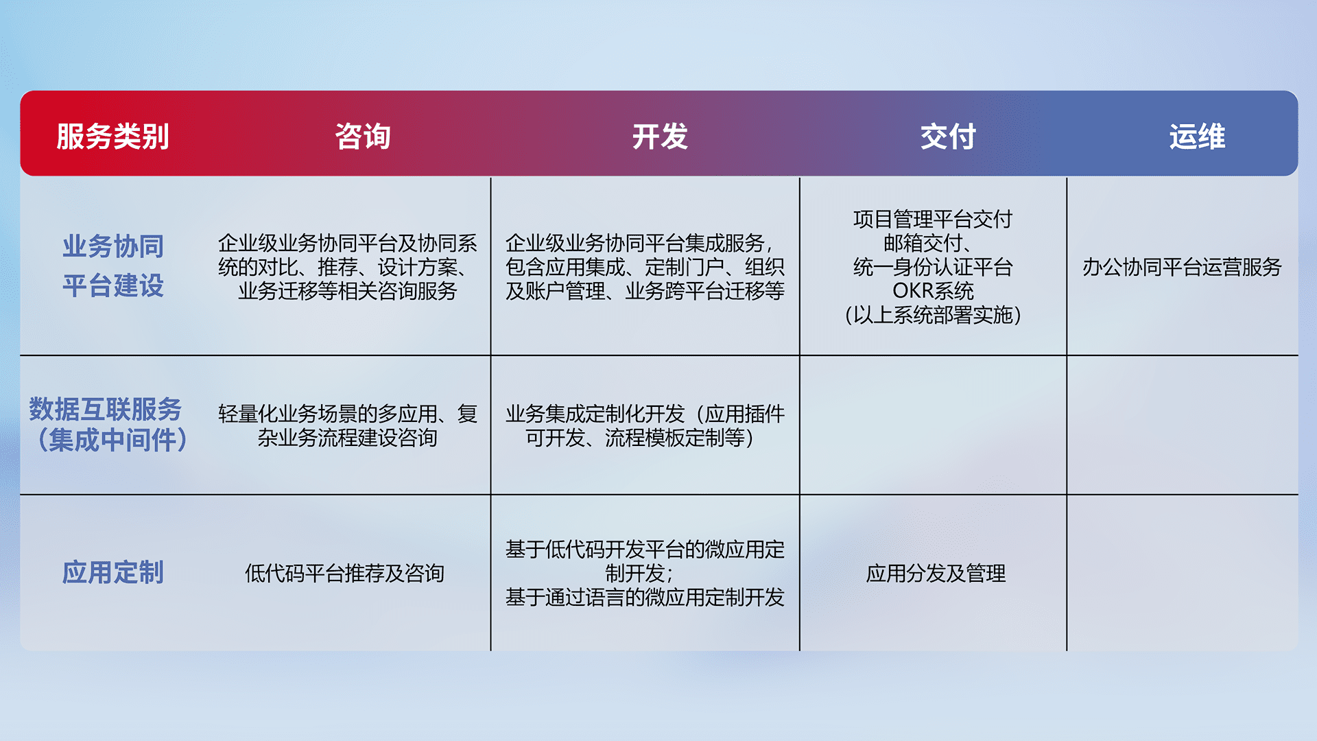 针对钉钉、、企微、、、IDaas等平台级产品提供产品的规划、、、、方案、、交付、、、定制化开发等服务,,,实现如统一协同办公、、、、智能客户服务、、混合会议管理、、智能数据查询、、、、等业务场景,,实现数字化转型。。。。